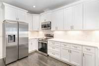 The kitchen deserves its own spotlight! Quartz countertops, ample cabinets and prep- space, room for bar stool seating, ceramic tile backsplash, stainless steel appliances, gold accents and a pantry complete the beautiful yet functional space.