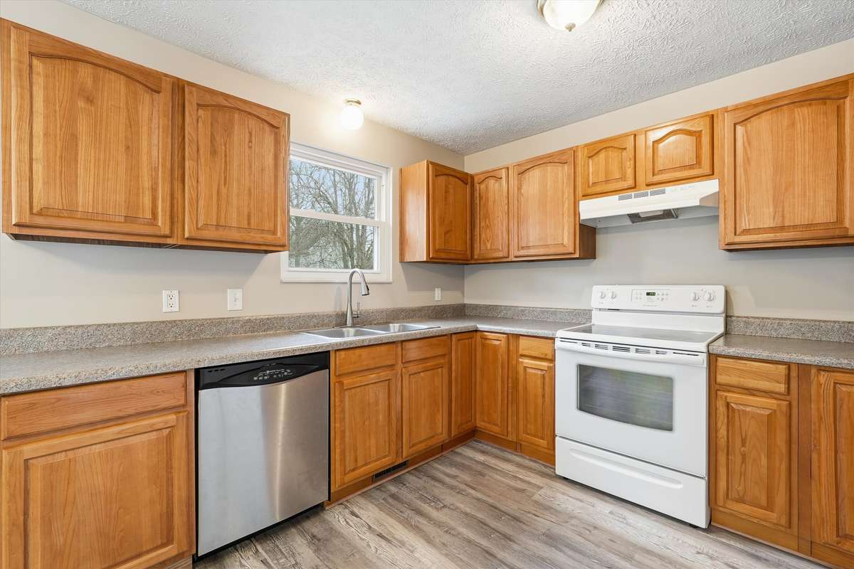 Inside, you’ll find updated flooring throughout, fresh neutral paint, and a living room anchored by a wood burning fireplace and a large bay window that fills the space with natural light. The kitchen provides functional layout and storage, bathrooms have been updated, and everything is easily accessible on one level. The expansive lot offers room to garden, play, or simply enjoy the privacy of a larger yard rarely found this close to the lake.