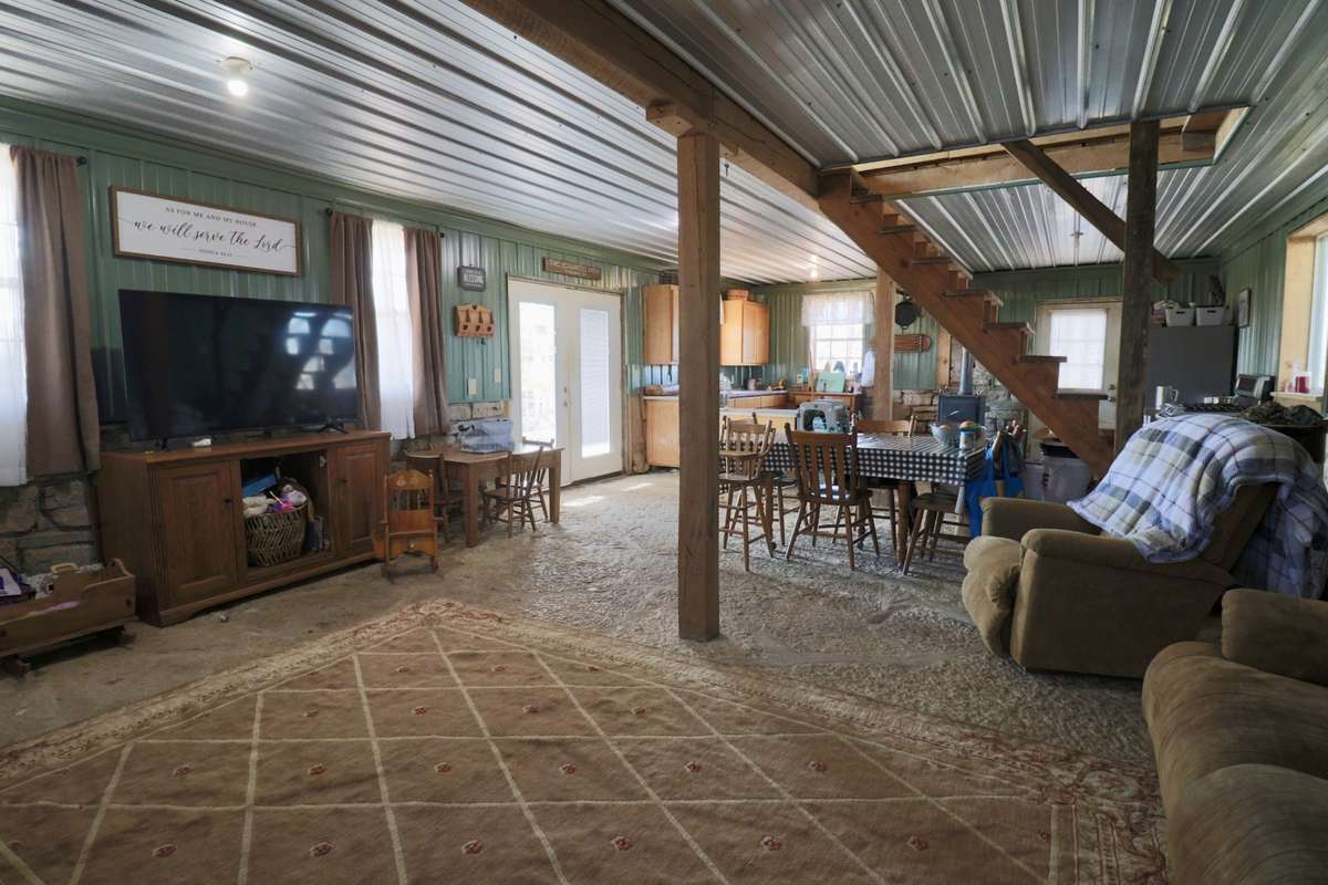 Escape to a true off- grid paradise at 4561 Mayberry Prong Rd. Situated on 73. 2 acres of secluded land, this property offers unmatched privacy and self- sufficiency. The custom home ( 36’ x 20’) is a testament to craftsmanship, constructed with wood milled on- site, featuring oak and hickory beams, standing seam metal interior walls downstairs, pine walls upstairs, and durable rock slab flooring with concrete.