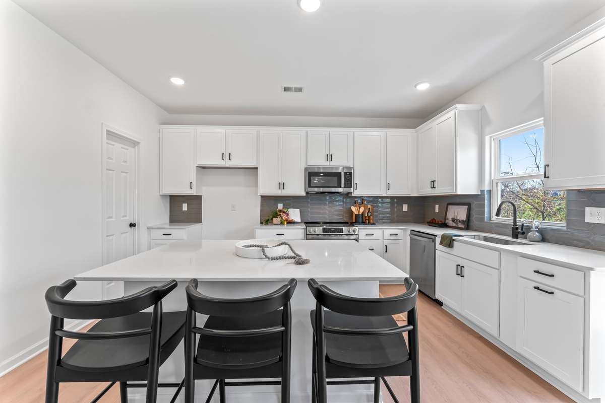 The Tipton plan features four bedrooms and a flex room, two full bathrooms and a powder room, open- concept living space perfect for entertaining and everyday living, stylish kitchen with ample counter space and cabinet storage, two- car garage, and outdoor living space.