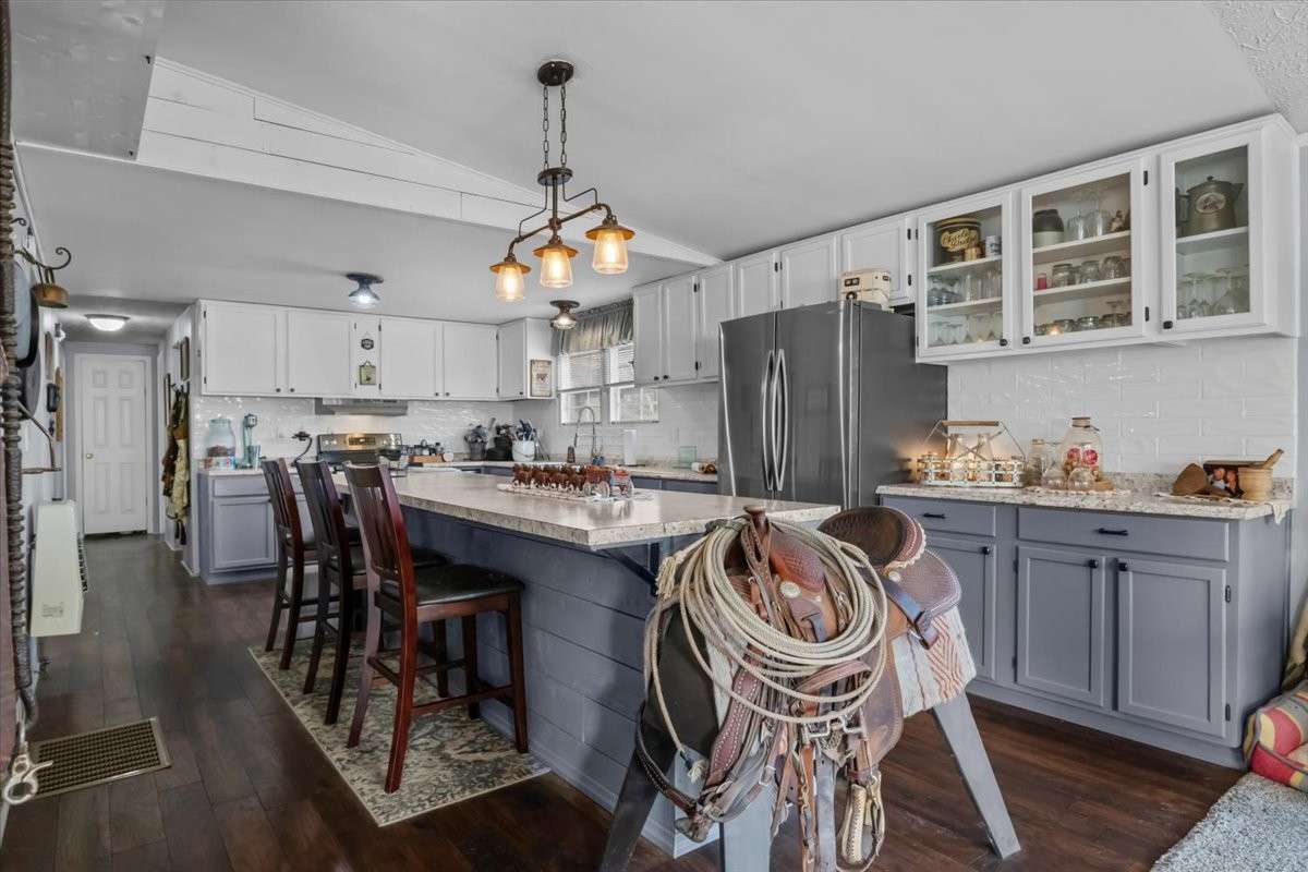 Inside, the home on a permanent foundation is ranch style and spacious. You’ll love the enormous 11- foot kitchen island, updated stainless steel appliances, and the efficiency of the smart- controlled wood pellet stove. With walk- in closets, built in storage, and plenty of space, it’s move- in ready. Whether you are looking for a permanent farm or a place to land while you build a custom estate in the back pasture, this property offers endless possibilities.