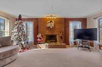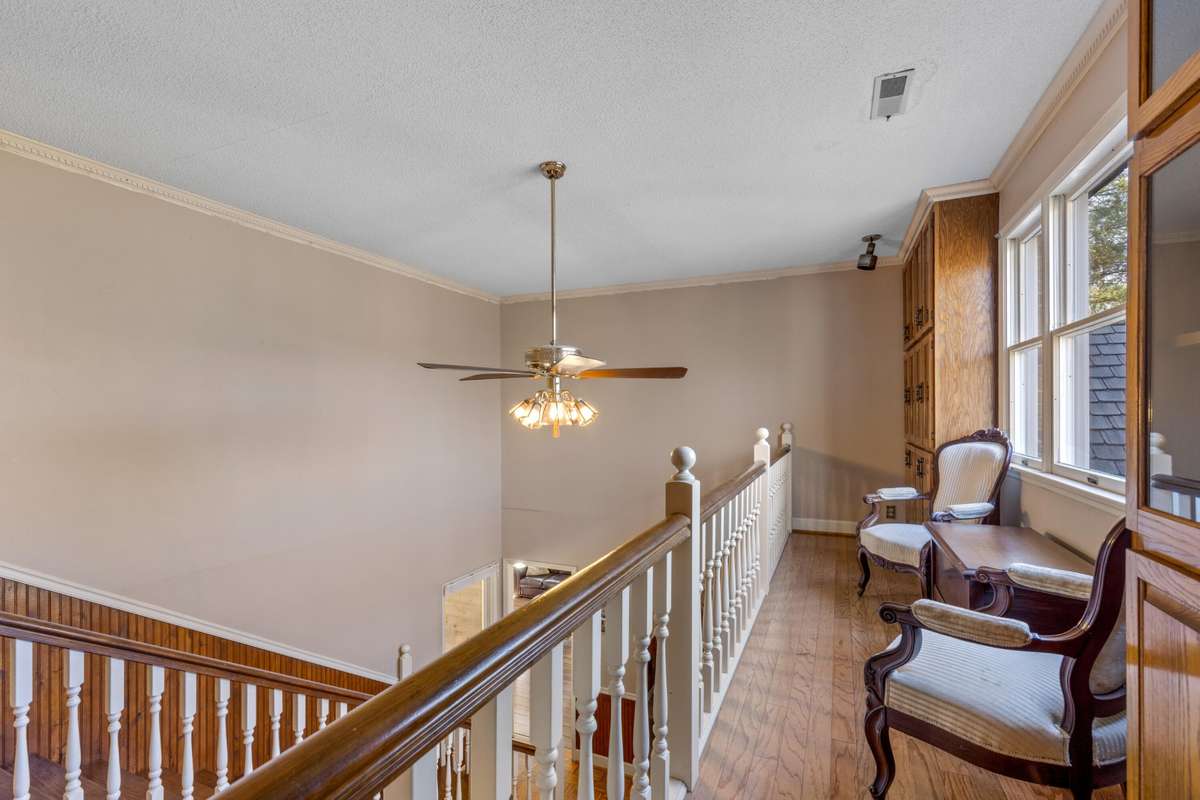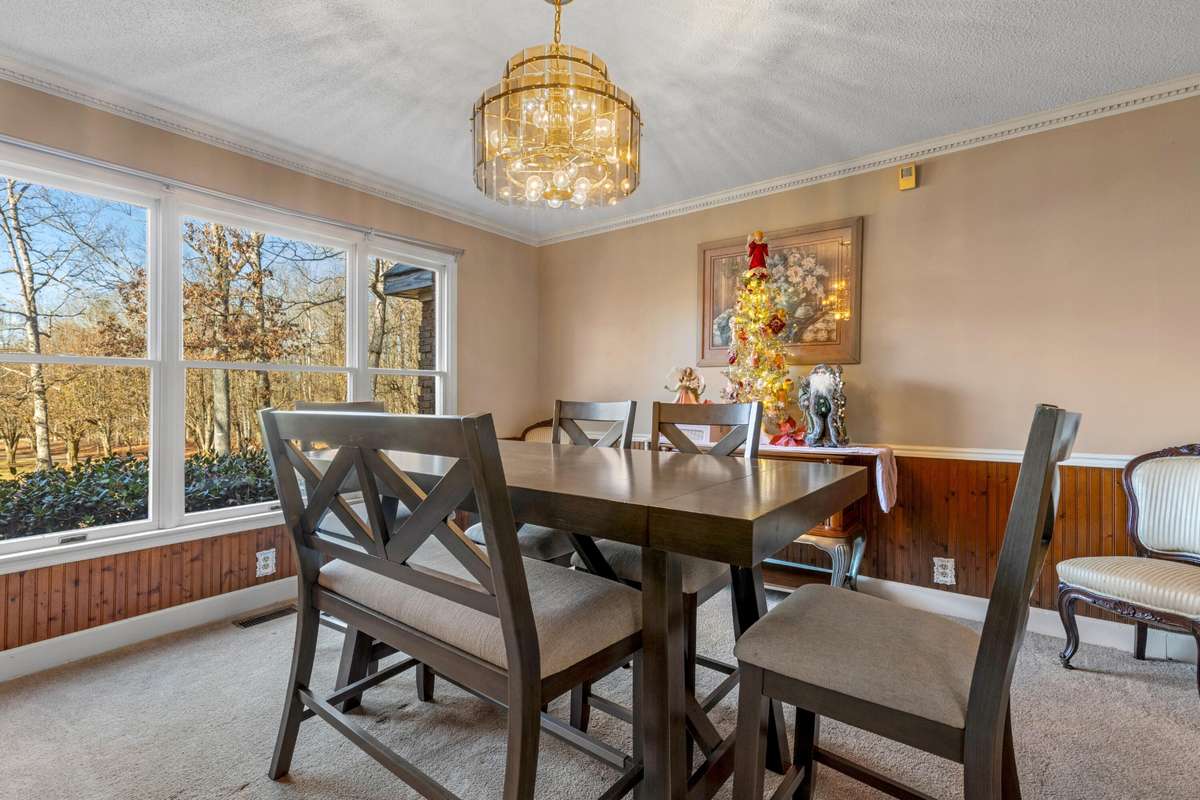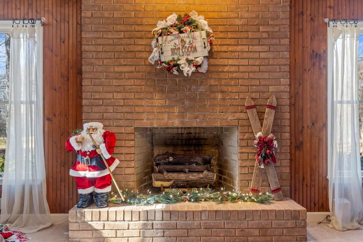 Through the double- door entryway, a gracious staircase sets the tone for the home' s warm and inviting interior. The foyer opens into the dining area and a comfortable living room centered around a classic brick fireplace. From here, a spacious sunroom draws you in with its panoramic views of the property and provides easy access to the covered back porch, perfect for enjoying quiet mornings or peaceful evenings.