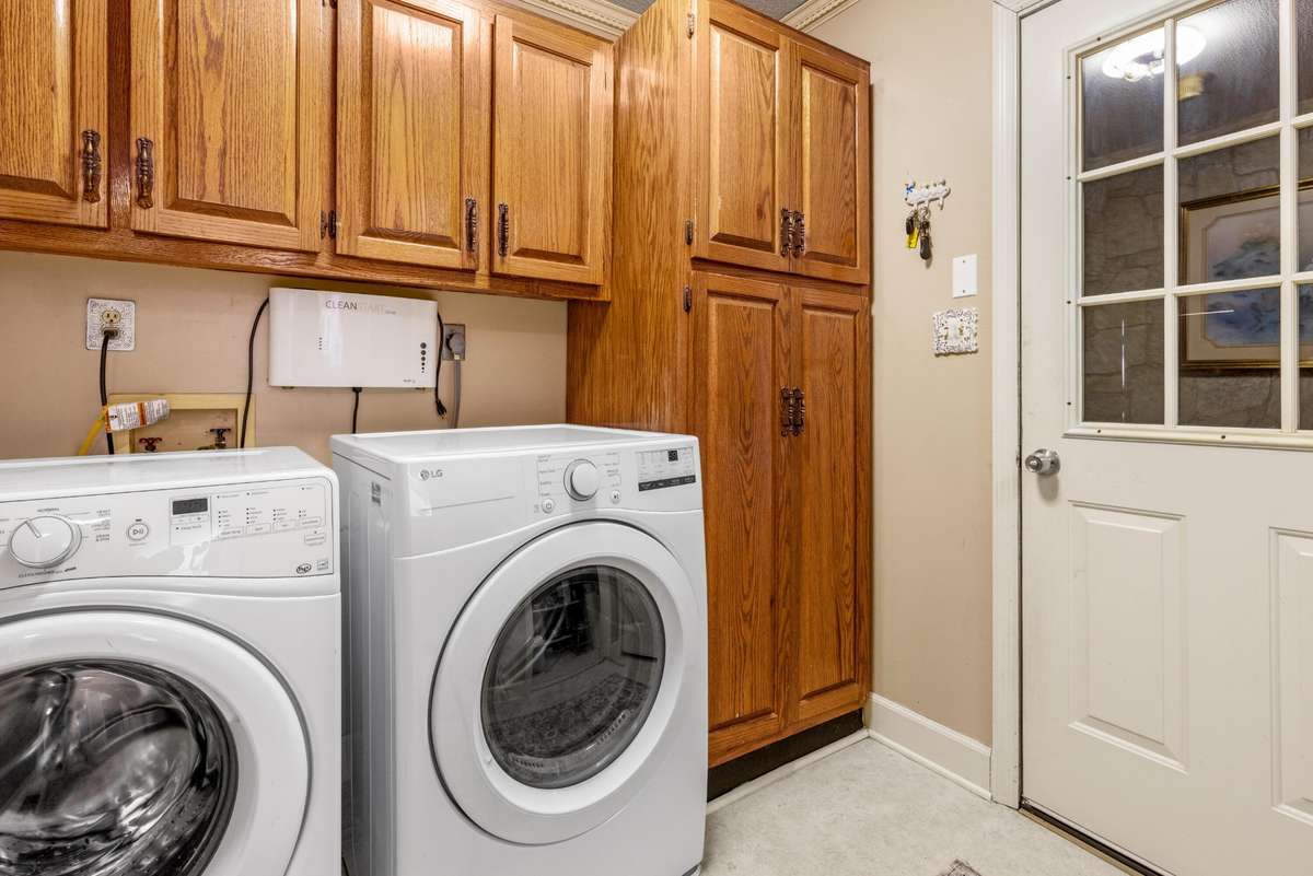 The generous kitchen offers abundant workspace, a breakfast nook, and seamless flow for everyday living. Nearby, the laundry room is outfitted with built- in shelving and ample storage to keep everything organized.