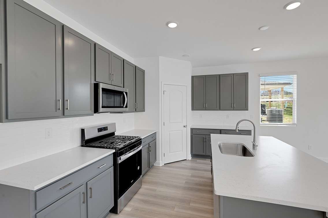 Upstairs, the thoughtful layout places the owner’s suite on one side of the home for privacy, complete with a walk- in closet and well- appointed bath. A versatile loft accompanies two secondary bedrooms, each with its own walk- in closet. A full bath with dual sinks and a separate tub/ toilet area ensures functionality for busy mornings, while extra storage and an upstairs laundry room keep everything organized.