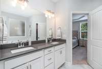 The main- floor primary suite features a tray ceiling, a large walk- in closet that happily swallows your entire wardrobe, and a beautiful bath with double vanities, a soaking tub, and a separate shower—because sharing is overrated.