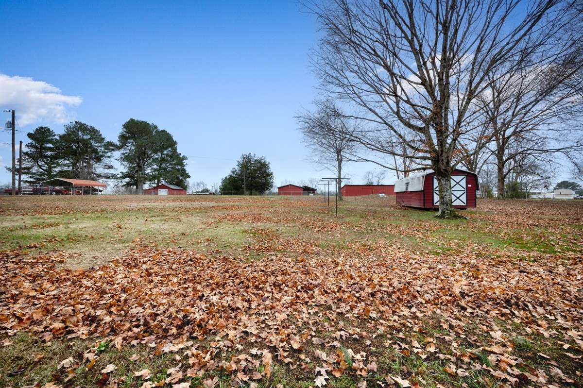 This 3BR/ 2BA 1652sf full brick home sits on approximately +/ - 2. 3 acres in a rural setting. It includes 2 outbuildings, fencing suitable for some livestock, and an in- ground storm shelter. Enter the spacious living room with lvp flooring from the covered front porch. The hallway leads to all three bedrooms and 2 recently updated 3/ 4 baths. The breakfast room has beautiful, exposed wood beams and flooring that leads seamlessly into the kitchen with an abundance of counterspace and wood cabinetry. The large den has vinyl flooring and a brick fireplace serving as the focal point. The laundry room has vinyl flooring, wood cabinets for storage and connections for a washer and dryer.
