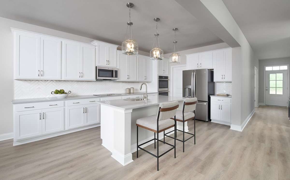 The island offers ample prep space and seating for casual dining or entertaining. Features durable quartz countertops and pendant lighting.