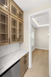 The main level features a wide entry, private study, formal dining room, and a dramatic staircase. The gourmet kitchen—with Monogram appliances, quartz countertops, butler’s pantry, and walk- in pantry—flows into a vaulted great room with fireplace and built- ins, perfect for holiday entertaining.