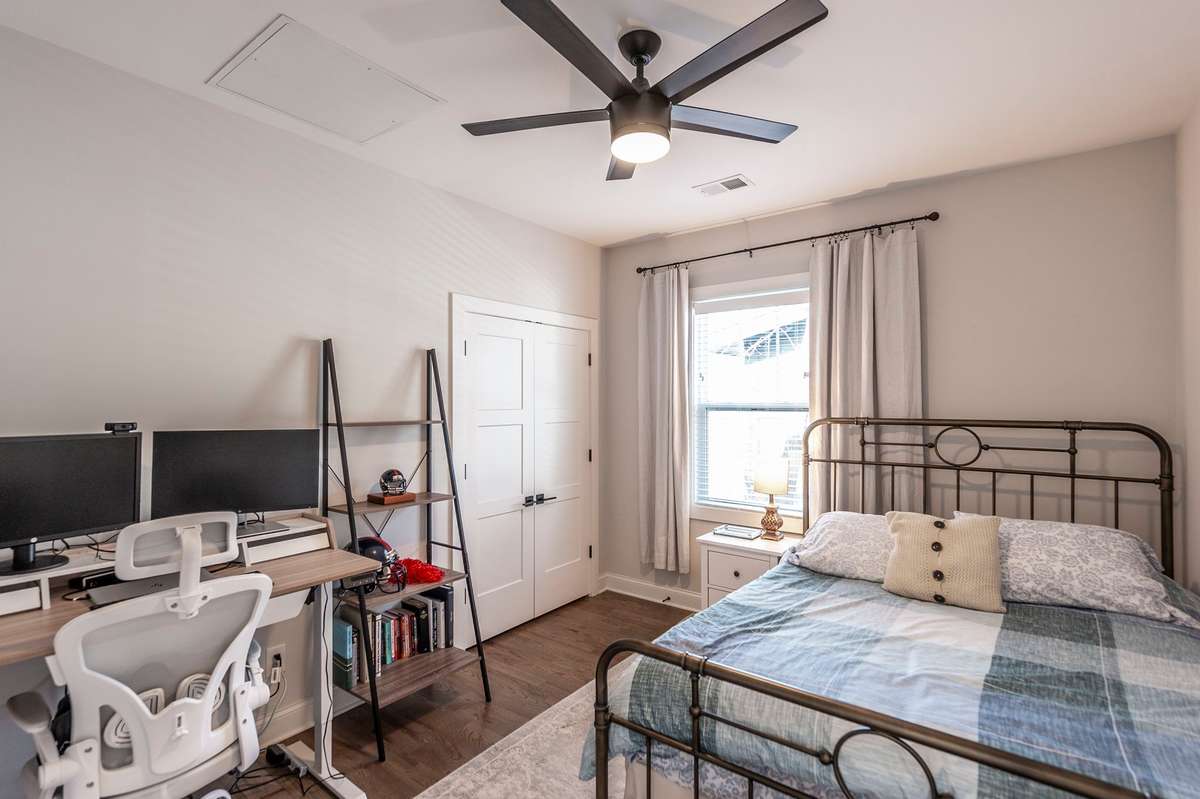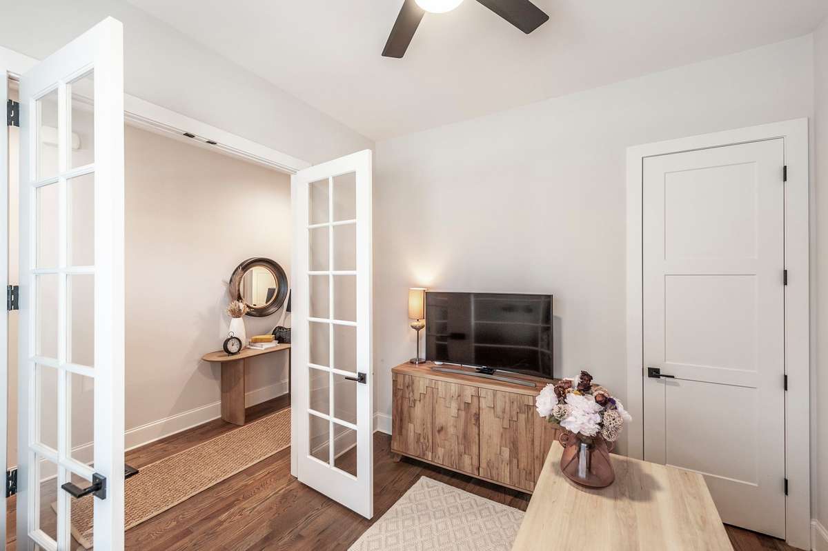 Beautifully maintained home in the heart of the emerging Buchanan Arts District - just minutes to downtown Nashville! This modern yet inviting home offers a flexible floor plan with 3 - 4 bedrooms and three full baths. The main- level bedroom is currently used as an office and includes added doors for privacy, making it an ideal work- from- home or guest space. Enjoy an open- concept main floor with hardwood floors throughout, upgraded tile, quartz countertops, stainless steel KitchenAid Pro appliances, and a stylish built- in wine/ beverage center perfect for entertaining.