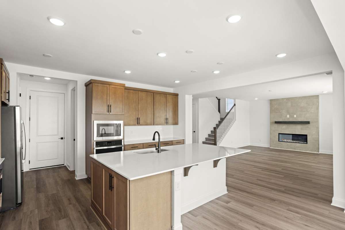 The GOURMET KITCHEN, appointed with all STAINLESS STEEL appliances and a large island, is OPEN to the LARGE GREAT ROOM. This expansive, seamless space is perfect for hosting gatherings, holiday feasts, or simply unwinding at home. A half bath is conveniently located downstairs for guests.
