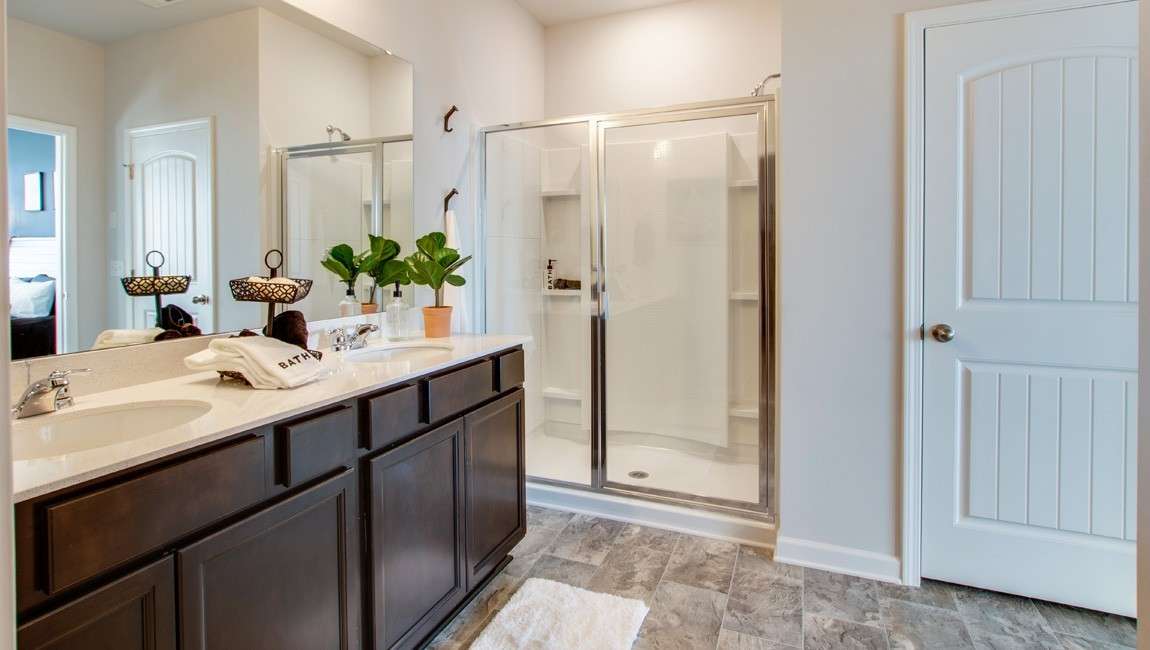 The primary suite is on the main floor and includes a walk- in closet, double vanity, glass shower, and linen closet. Upstairs, a large bonus room offers a second living area, perfect for work, play, or guests, along with two oversized walk- in closets for added storage. Three additional bedrooms, two with walk- in closets, share a full bathroom.