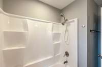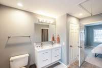 The primary ensuite bathroom features a double vanity and abundant storage.