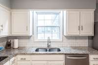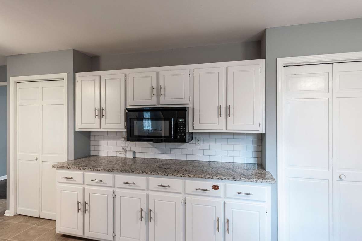 The spacious eat-in kitchen features generous cabinetry, granite countertops, and exceptional storage throughout.