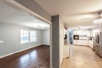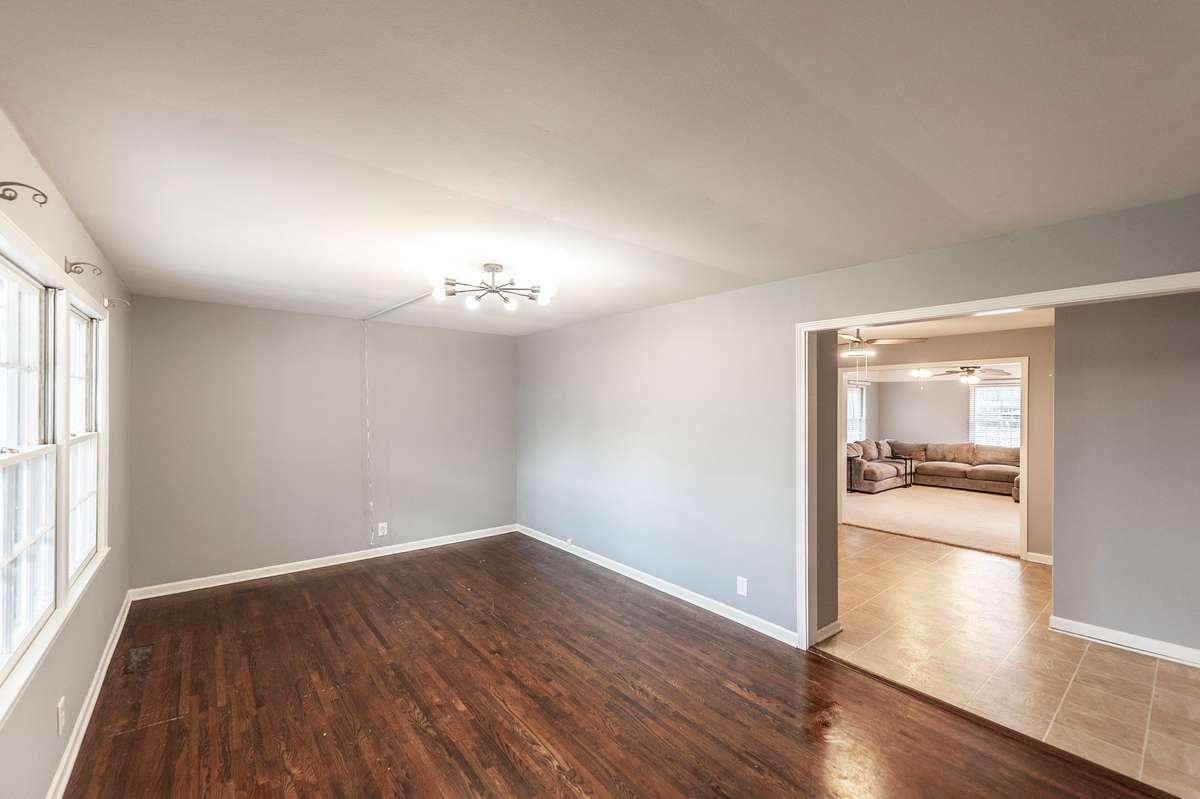 The formal living room is highlighted by stunning hardwood floors, creating an elegant and inviting atmosphere.
