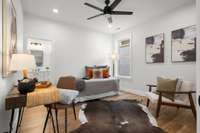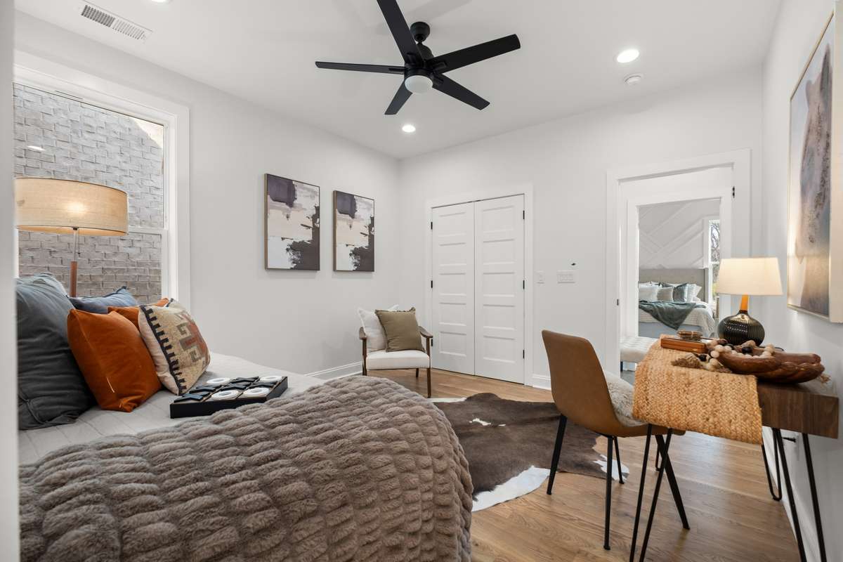 Brand new home with thoughtful finishes throughout. A two- story foyer leads to an open living, dining, and kitchen area with tall ceilings and solid sand- and- finish hardwoods ( tile only in the wet areas) . The kitchen features two- tone cabinetry, quartz countertops, custom range hood, walk- in pantry, and under- cabinet, upper- cabinet, and toe- kick lighting around the island with seating. Upstairs, a comfortable loft/ second living area sits between bedrooms. The primary suite offers a vaulted ceiling, large custom walk- in closet, and a tiled walk- in shower with frameless glass and double vanity. Covered back porch overlooks the fenced back yard. 2x6 exterior wall construction, energy- minded details, and a 1- year builder’s warranty provide peace of mind. Less than 4 miles to Downtown.