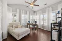 The Owner's Suite is sweet w/high trey ceiling, new ceilng fan, new hardwood floors & newly added custom sconces for ambiance or reading. This bdrm has a private hall entrance so guests are not looking right in. Enough room for a king suite to fit.