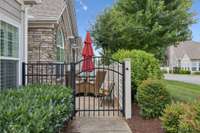 This is the Privacy-fenced courtyard at the entry. The front door leads you into a real entryway. Upon entry, the living room is to the left and dining is to the right.