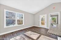 • Open- concept living, kitchen, and dining area with a vaulted ceiling