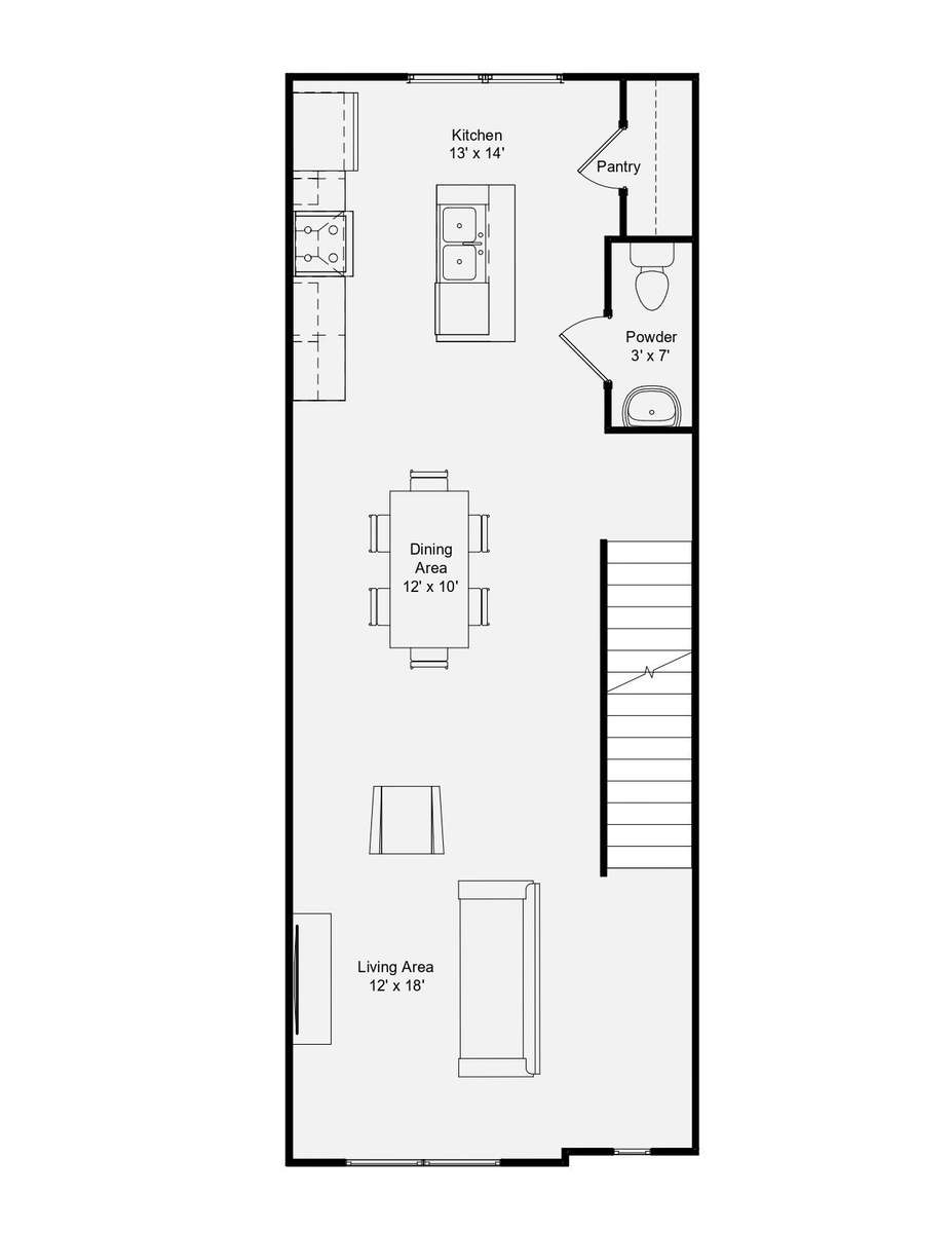 Family room open into dining space and kitchen. Pictures are of model not exact home. Selections and features may vary per home.