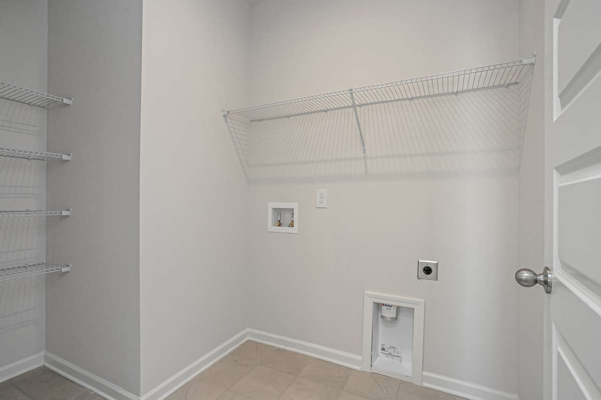 Spacious laundry with built-in linen shelving near your primary bedroom downstairs.  **All photos are of a previously constructed Covington floorplan.**