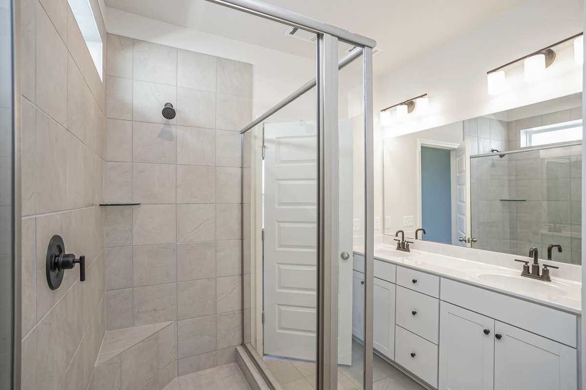 Double vanities, tile flooring, and cultured marble countertops in your primary suite. Choose between a larger shower or shower and tub at NO cost!  **All photos are of a previously constructed Covington floorplan.**