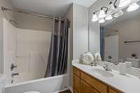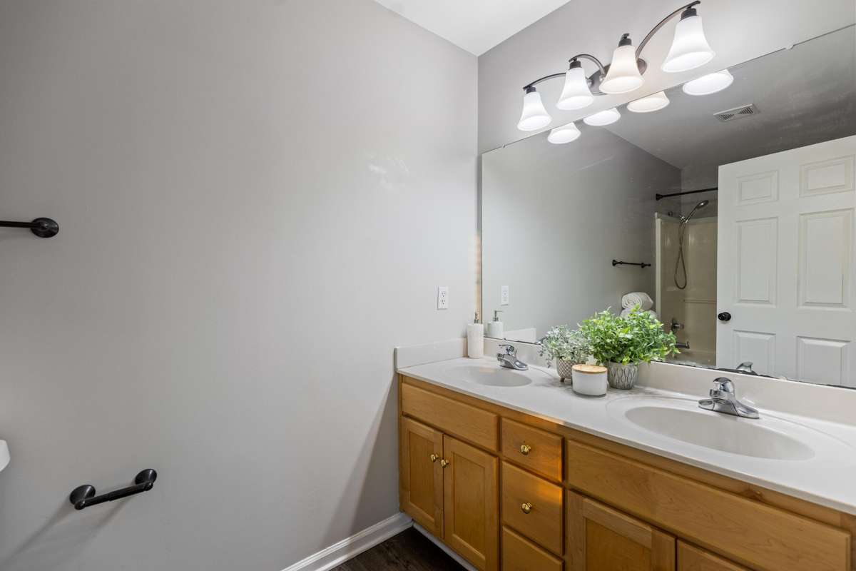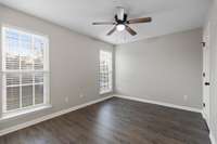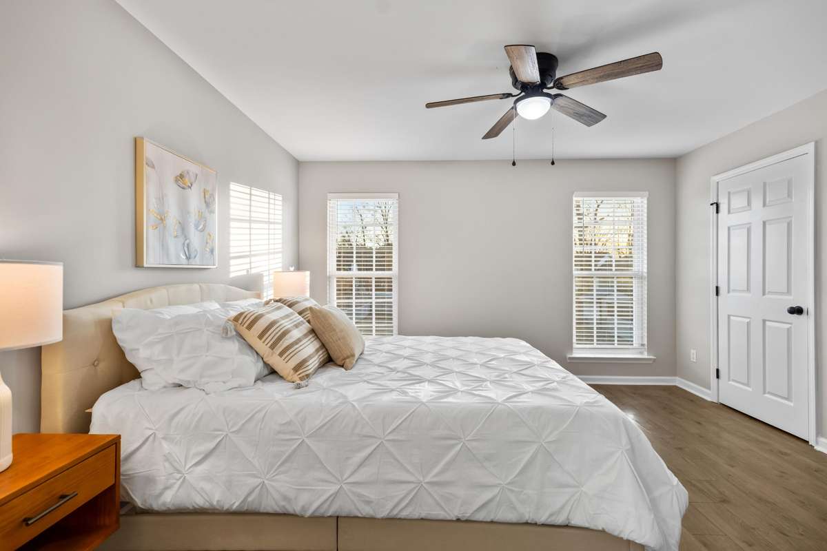 The primary bedroom features a ceiling fan, a generous walk- in closet, and an en- suite bath with a dual- sink vanity. The second bedroom also includes a ceiling fan and a large walk- in closet.