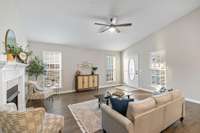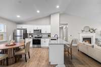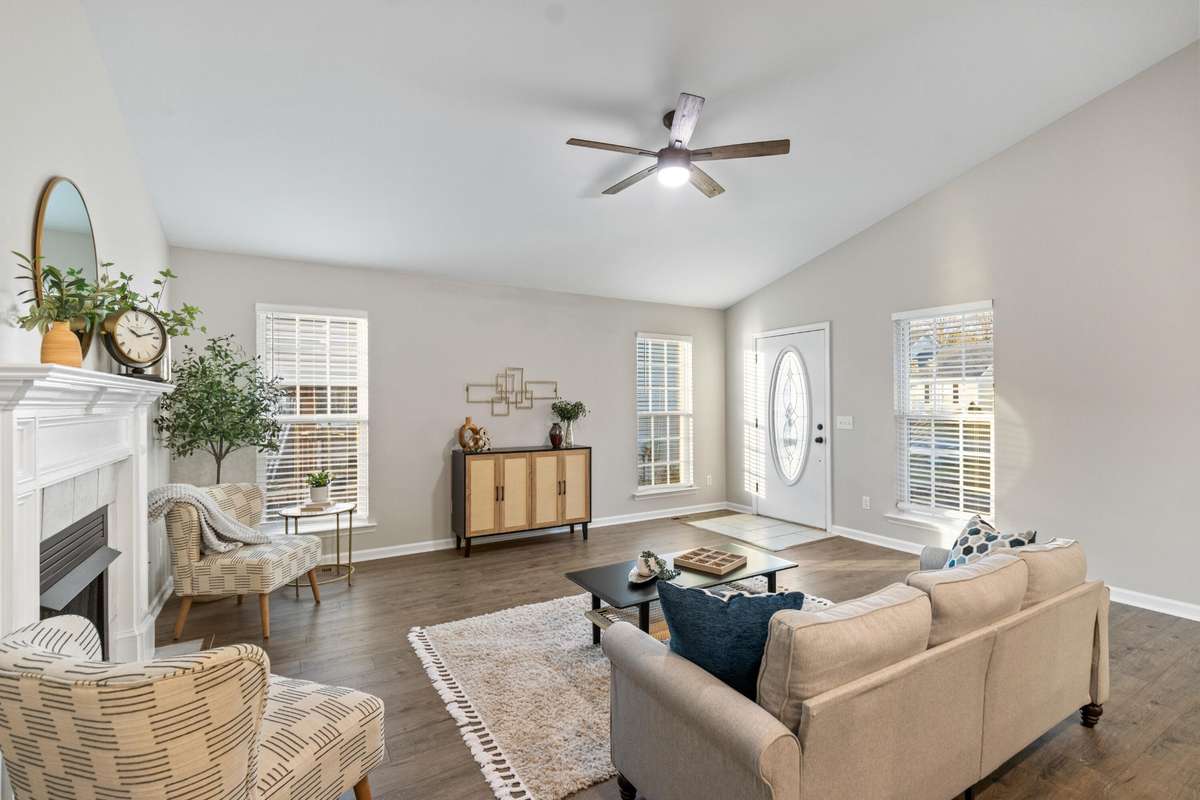Inside, the open great- room concept features vaulted ceilings and a cozy fireplace, creating a warm and inviting atmosphere. Recent updates include fresh paint, newer flooring, and a newer Rheem HVAC system, making this home truly move- in ready.