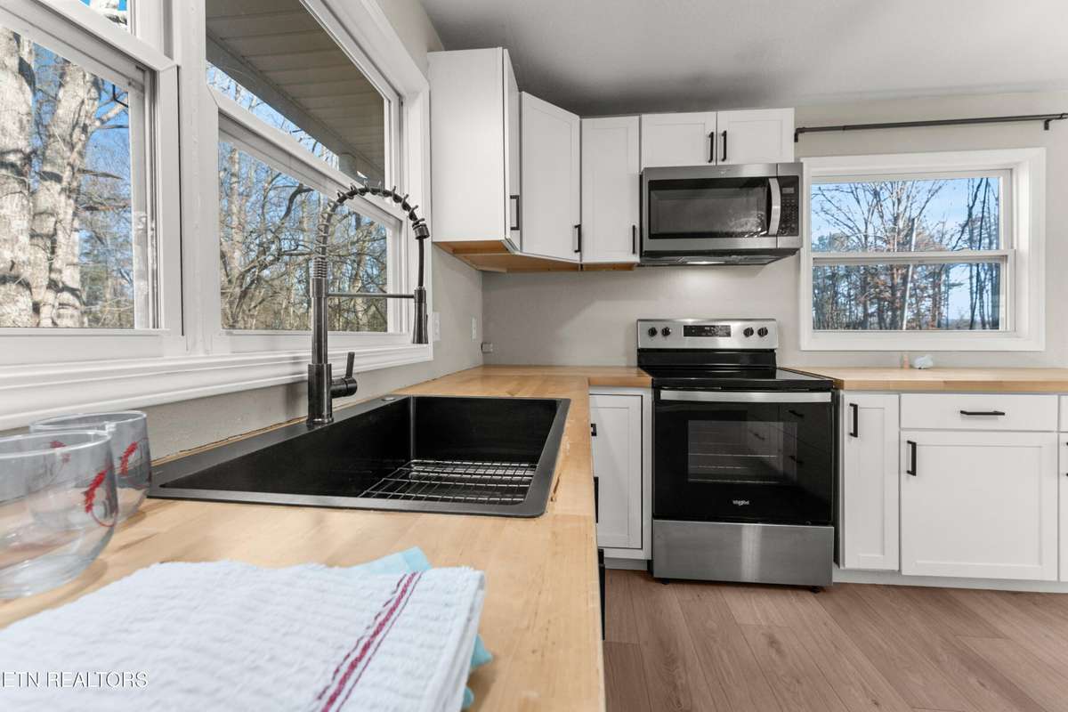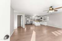 Walk in to a spacious open floorplan between the living area, dining area, and the updated kitchen with its island and granite counters complimenting the stainless steel appliances.