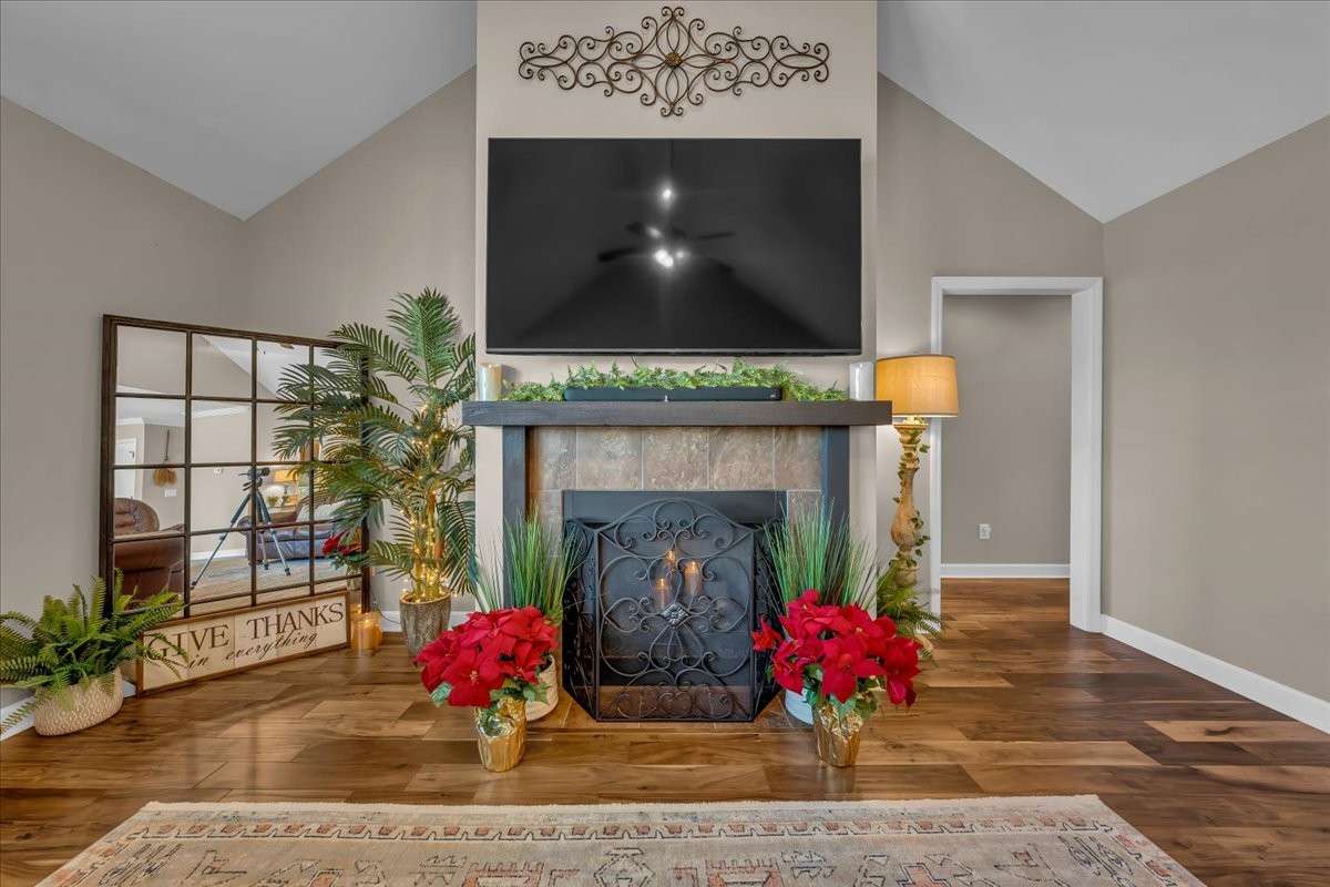 Discover this charming custom brick and stone three- bedroom, two- bath home on a prime corner lot! With an inviting open floor plan, enjoy hardwood flooring throughout and a great room highlighting a vaulted ceiling and a cozy gas fireplace. The beautifully designed kitchen features custom cabinets, stainless steel appliances, a spacious peninsula island with bar seating, and a pantry for all your culinary needs. Bright dining area with sunny windows enhances the delightful atmosphere. The primary bedroom offers a serene retreat with a full bath, including a large vanity, shower/ tub combo, and walk- in closet. Two guest bedrooms feature plush carpet and generous closet space, while the guest bath showcases elegant tile flooring. Complete with a large utility room with cabinets, a sink, and ample storage options. The large covered front porch and back porch are perfect for relaxation. A fantastic, detached garage and a vast backyard with a privacy fence add to the appeal. Conveniently located near I- 24 and Murfreesboro! Storage building is negotiable.