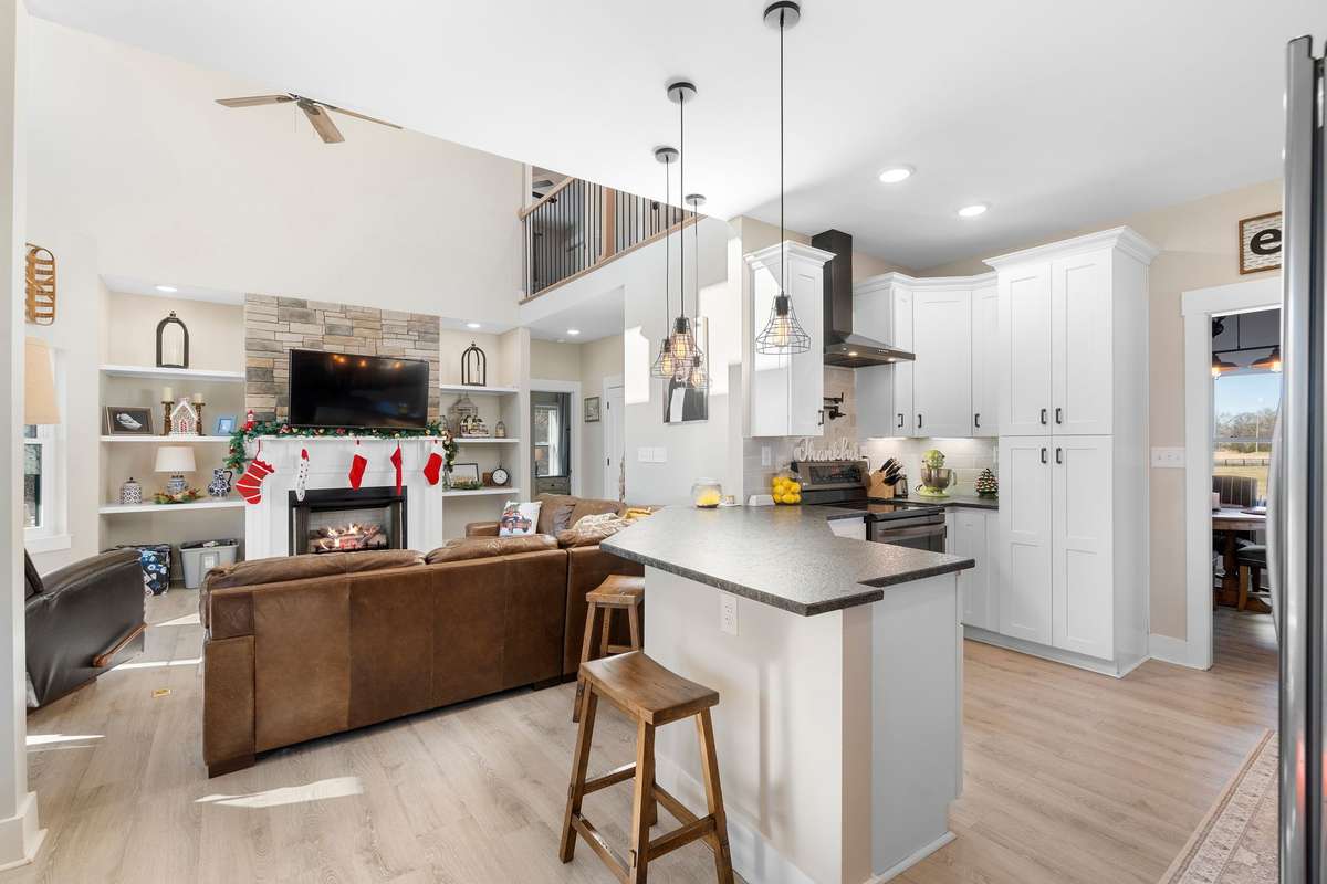 Enjoy country charm with a gravel driveway and a front exterior featuring a charming wraparound porch, perfect for relaxing and sipping your morning coffee. Step inside to a bright, inviting living area with hardwood floors, French doors, and a cozy gas/ stone fireplace with built- ins.
