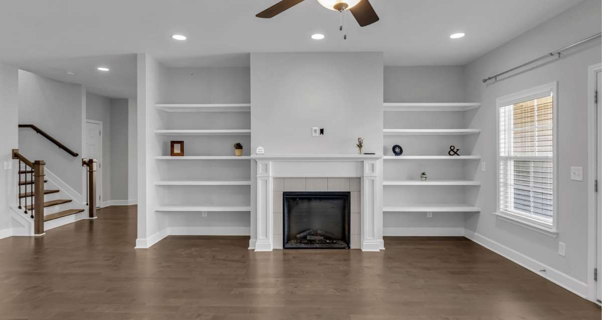 View of your large living room with a cozy fireplace, built in shelves, and a perfect place for your TV above the fireplace
