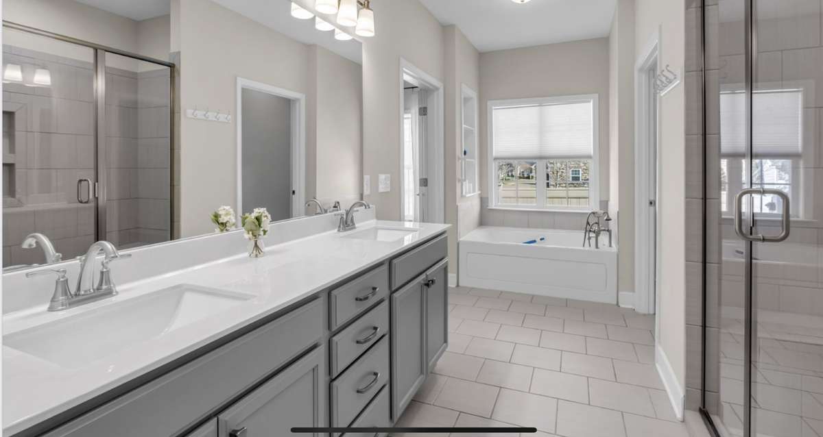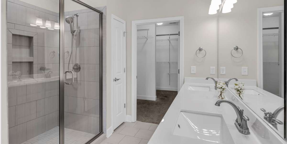 Primary bathroom with double vanities, tile flooring, a large walk in tile shower, linen closet, and a very large walk in closet