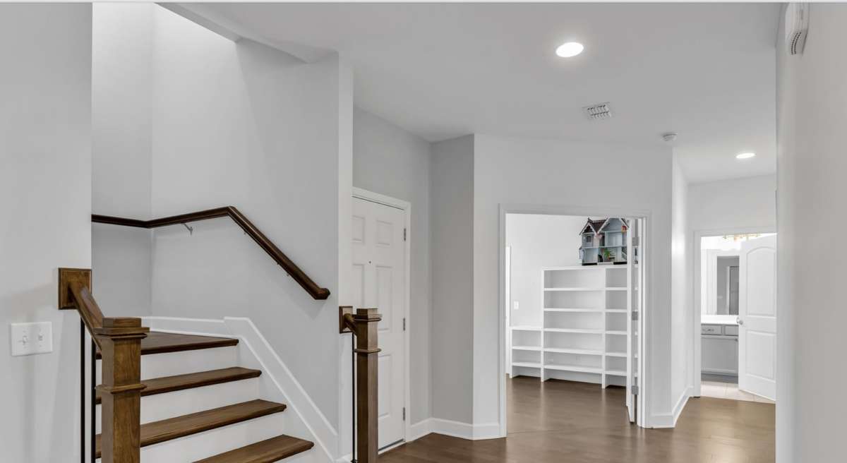 Alternate view of the entry foyer with an office/secondary bedroom with built in shelves, the hallway full bath, and the staircase to the bonus/4th bedroom