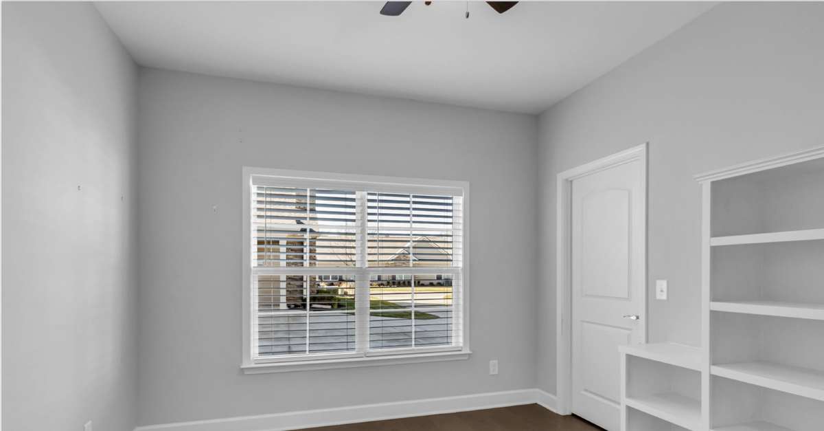 Secondary bedroom currently used as an office with built in shelving and a walk in closet.  Laminate flooring in this room too!
