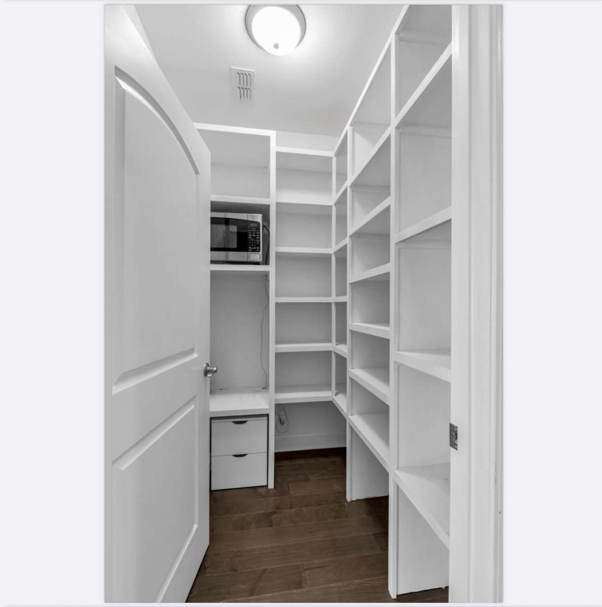 This pantry is large enough for small appliances, extra dishes, all the food, maybe even a coffee station!  Microwave stays.