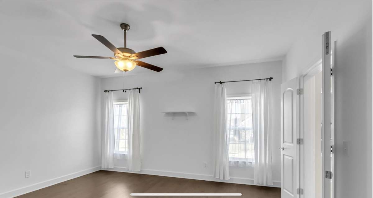 Primary bedroom with two windows, a ceiling fan, and laminate flooring