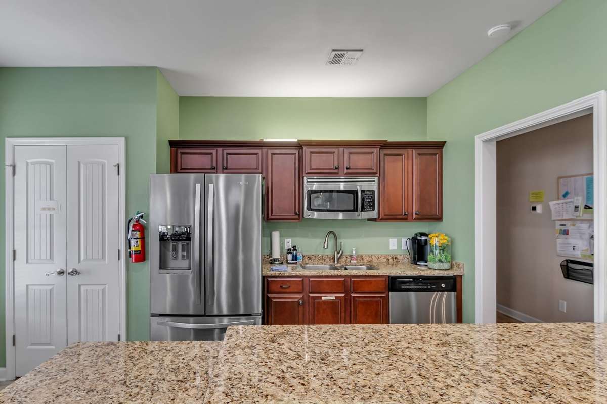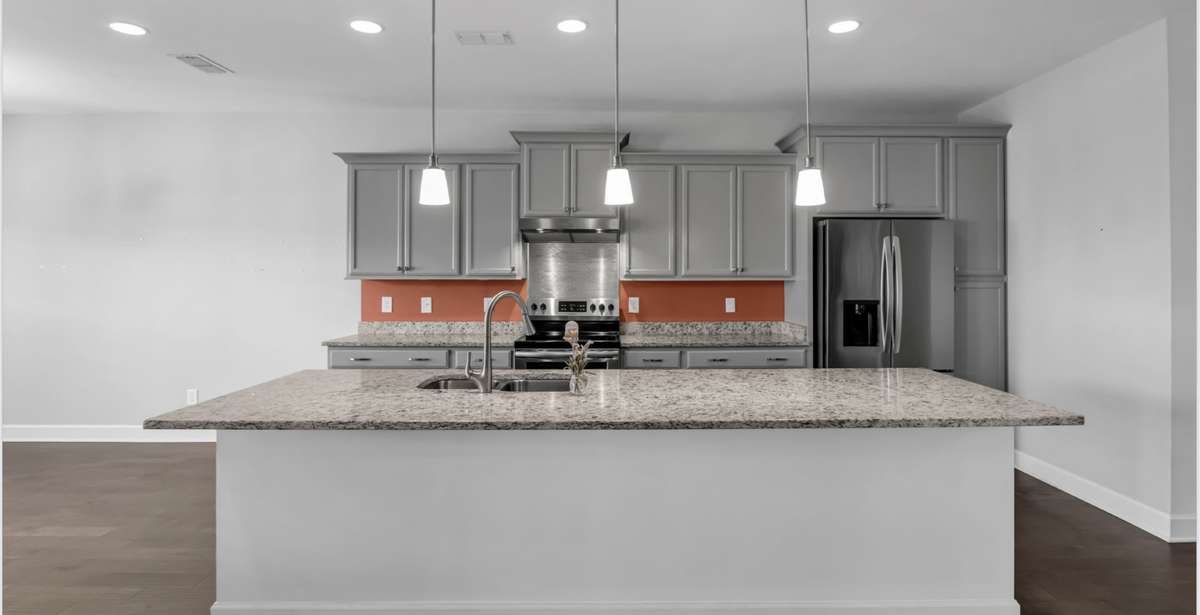 Large kitchen with plenty of counter space.  Granite counters, stainless appliances, and recessed and pendant lighting. Accent painted kitchen island.