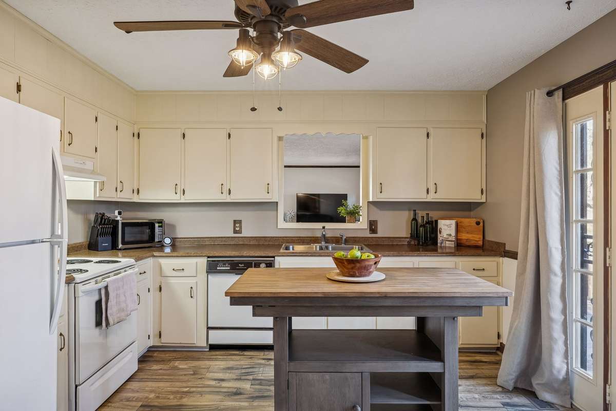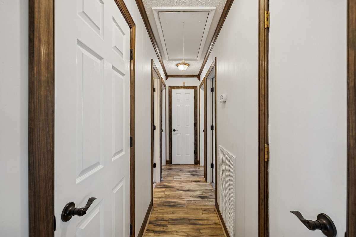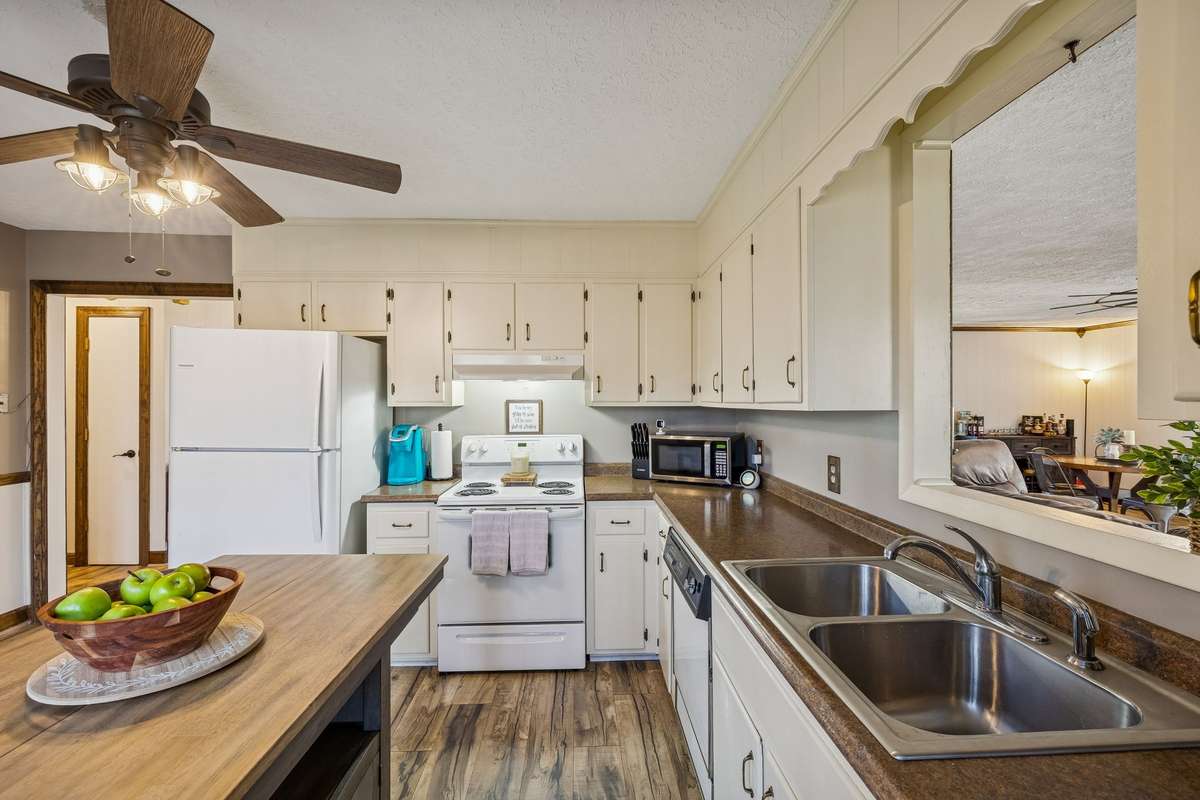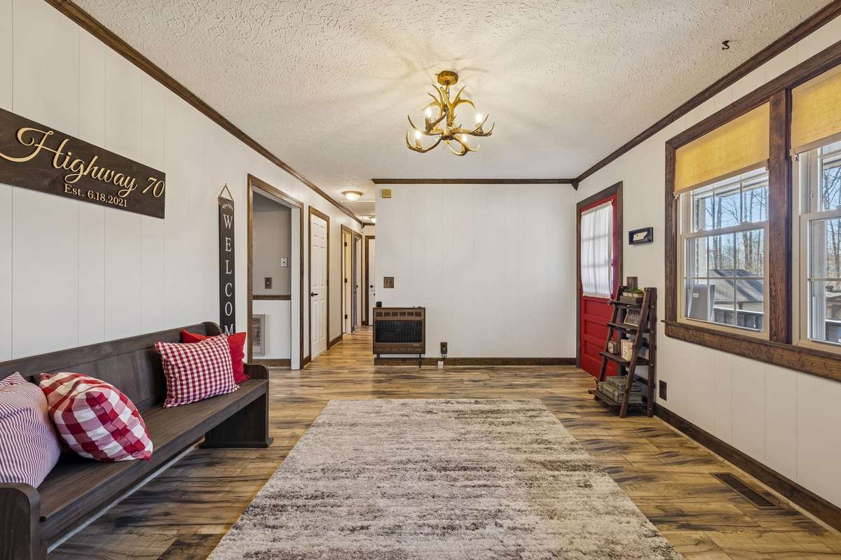 Inside, the home features a spacious family room with multiple windows that fill the space with natural light and provide peaceful views of the surrounding woods. New luxury vinyl plank flooring runs throughout the main living areas, while new carpet adds comfort in all three bedrooms. The kitchen offers a pass- through to the family room, creating an open and connected feel, along with generous cabinet space for storage and everyday use.