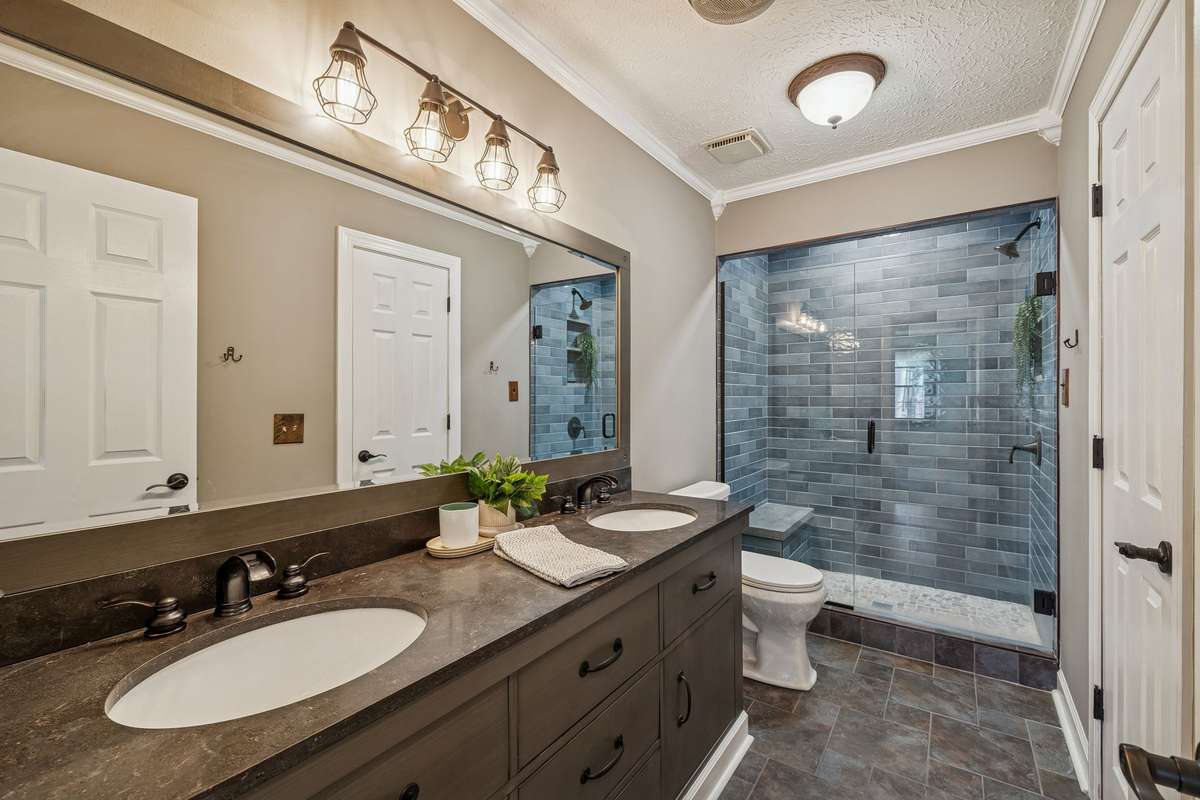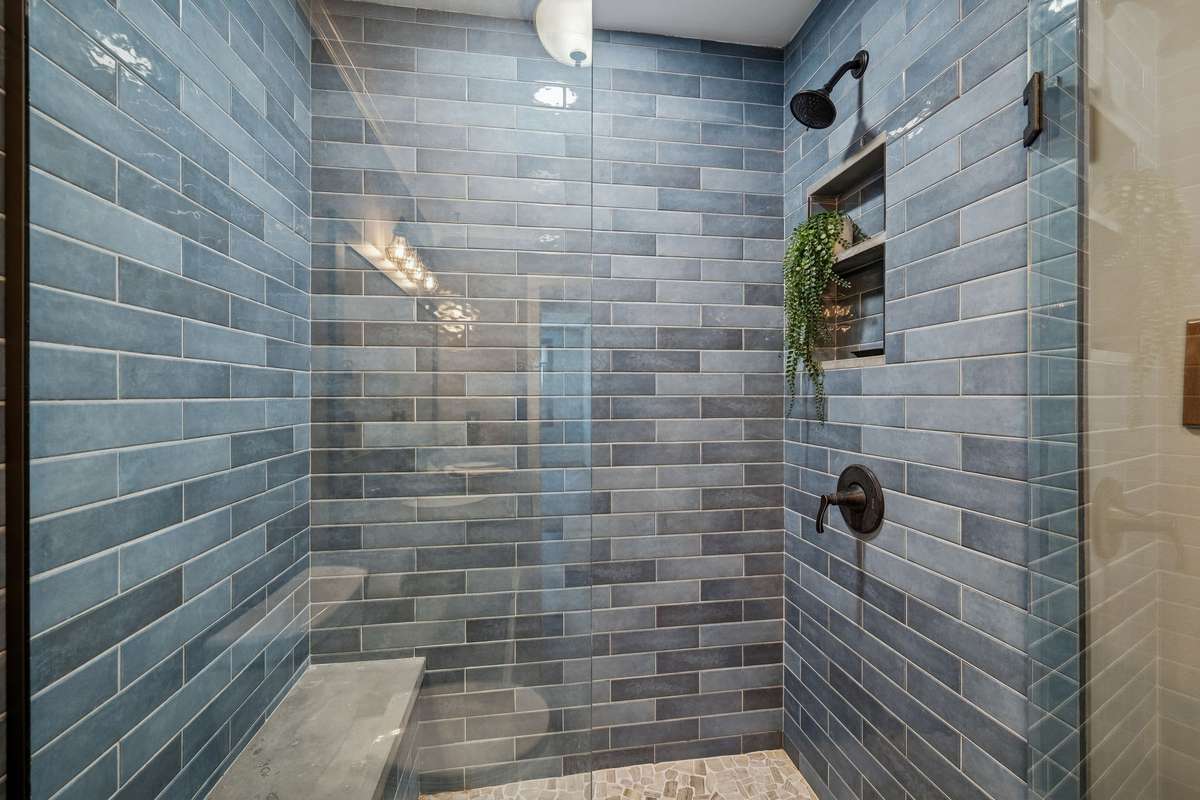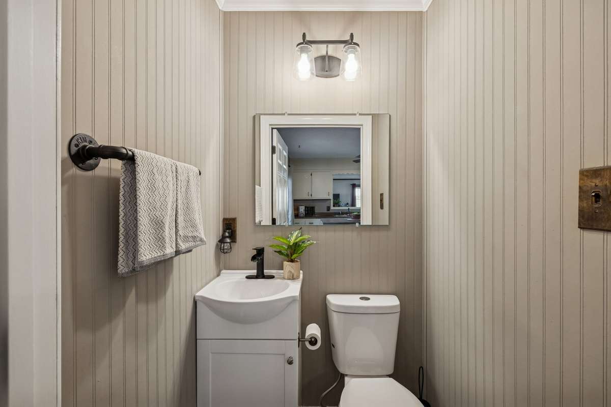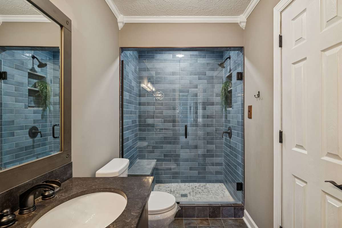 The full bathroom has been completely remodeled with custom tile work and a walk- in shower with a built- in bench, combining clean design with everyday functionality. A half bath provides added convenience for guests and daily use.