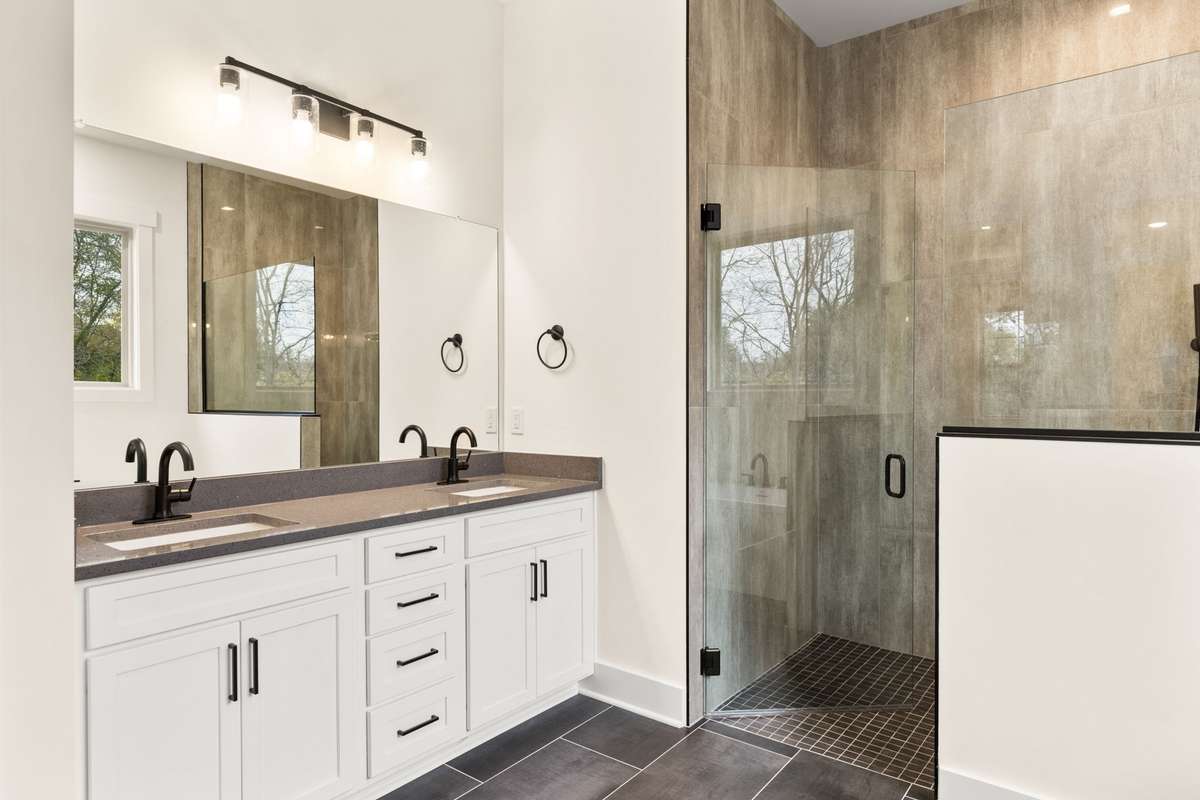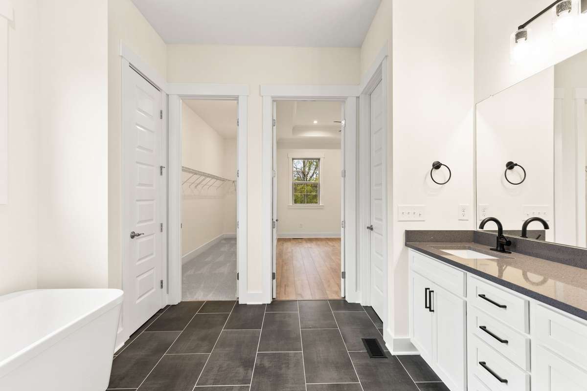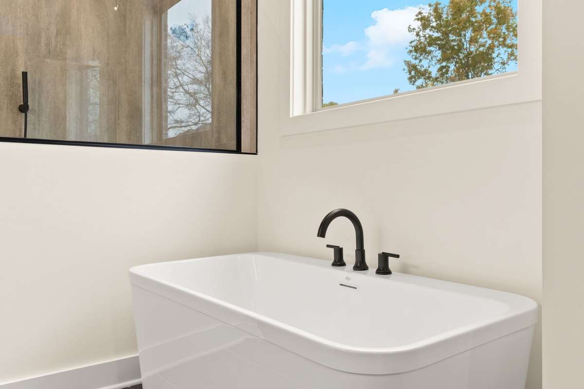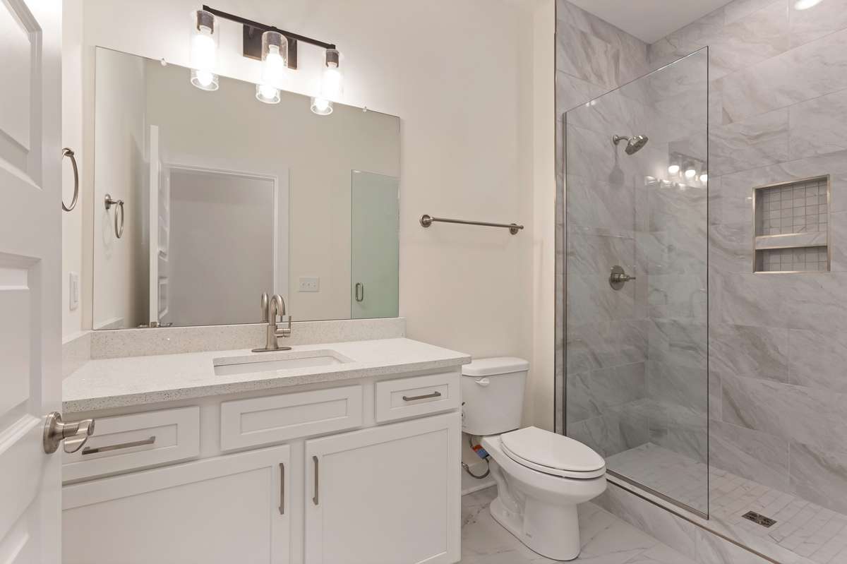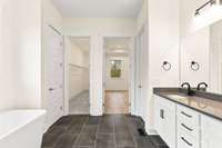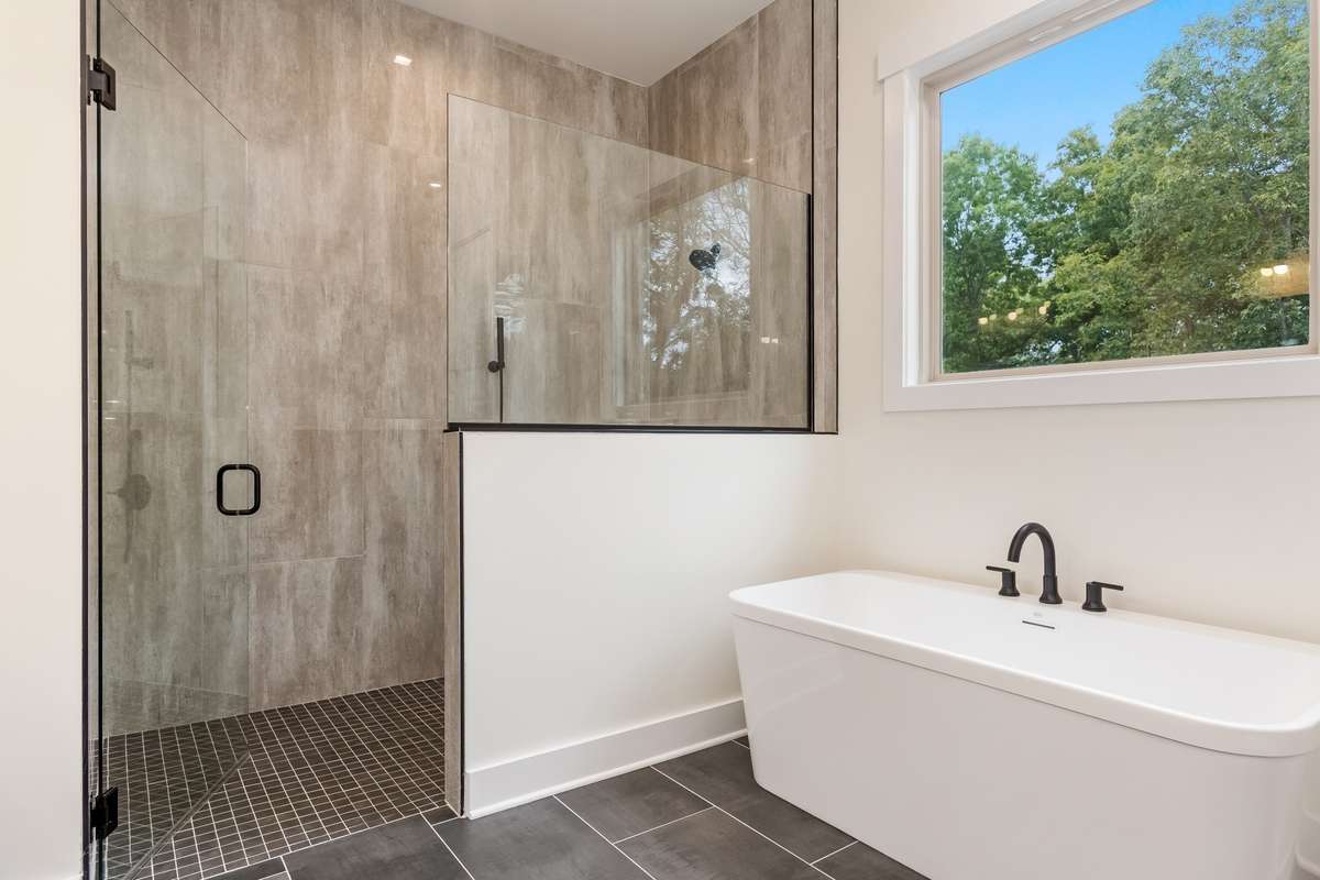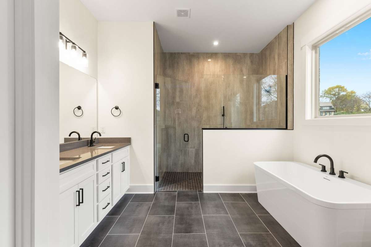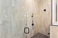 Primary bathroom with large oversized shower, freestanding tub and quartz countertops.