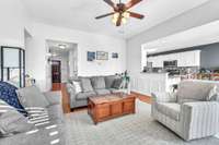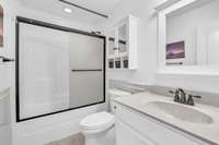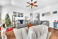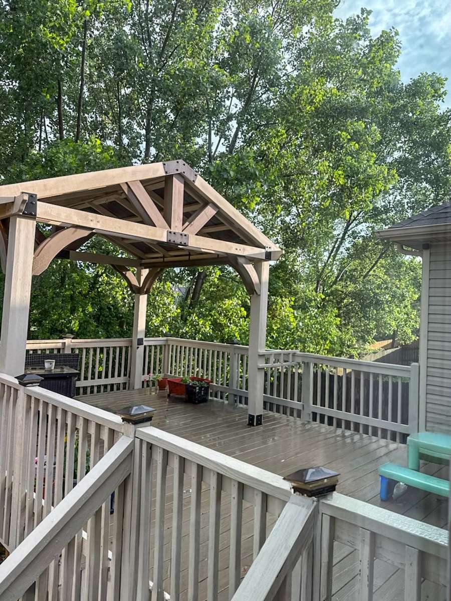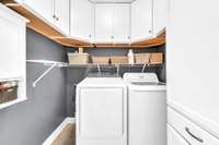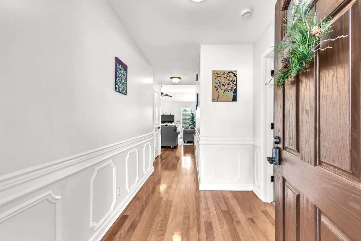 This neighborhood was designed to be at the center of everything – shopping, hospital, post and interstate. The home boasts stylish wainscoting throughout, adding a touch of elegance to every room. The kitchen is beautifully appointed with granite countertops, white cabinets, and a striking accent wall, complemented by light hardwood flooring. The primary bedroom features a sophisticated double tray ceiling and a decorative medallion, providing a luxurious atmosphere. In the primary bathroom, you' ll find double vanities, a spacious walk- in closet, and both a separate tub and shower for ultimate comfort. The laundry room is exceptionally equipped, offering the most cabinets you are likely to see, providing ample storage and organization space. Outside, enjoy a pergola and deck ideal for relaxing or entertaining guests. Additional amenities include a storage shed and a tree- lined backyard.