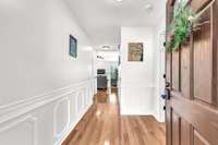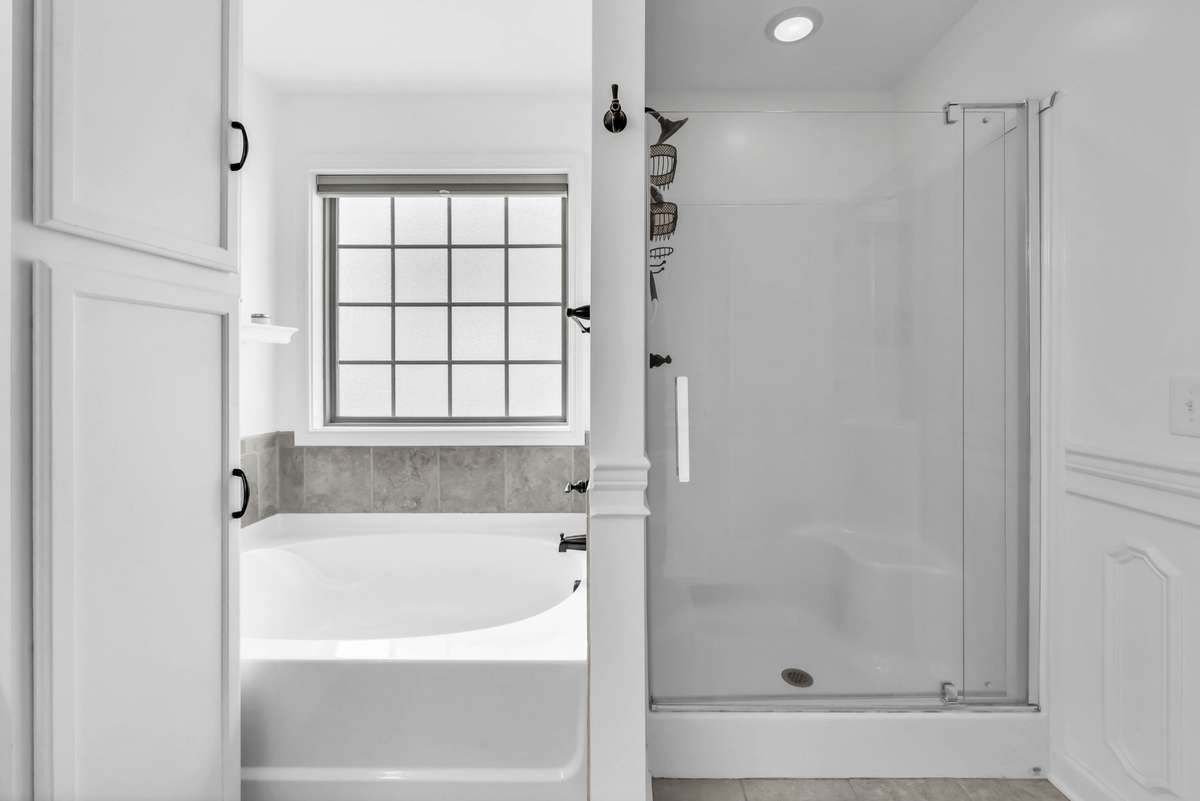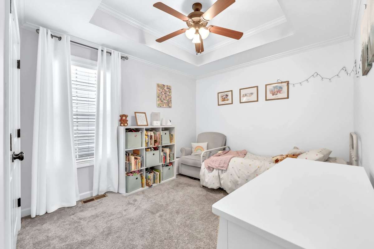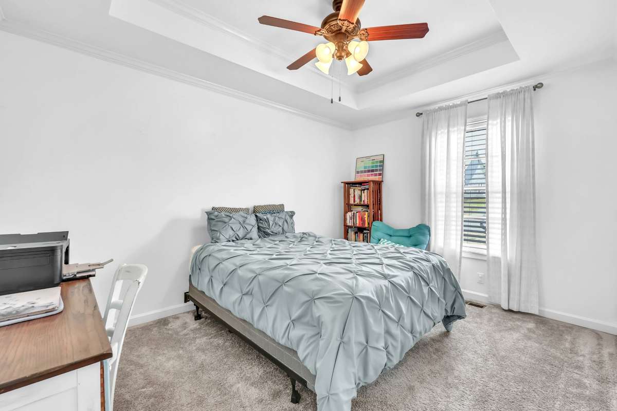 This neighborhood was designed to be at the center of everything – shopping, hospital, post and interstate. The home boasts stylish wainscoting throughout, adding a touch of elegance to every room. The kitchen is beautifully appointed with granite countertops, white cabinets, and a striking accent wall, complemented by light hardwood flooring. The primary bedroom features a sophisticated double tray ceiling and a decorative medallion, providing a luxurious atmosphere. In the primary bathroom, you' ll find double vanities, a spacious walk- in closet, and both a separate tub and shower for ultimate comfort. The laundry room is exceptionally equipped, offering the most cabinets you are likely to see, providing ample storage and organization space. Outside, enjoy a pergola and deck ideal for relaxing or entertaining guests. Additional amenities include a storage shed and a tree- lined backyard.