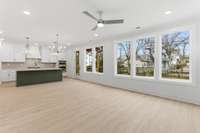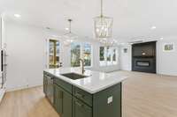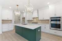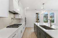 Inside, natural light pours across wide- plank hardwoods, leading you into an open- concept great room with 9’ ceilings and a striking fireplace—the centerpiece for gatherings. The chef’s kitchen is a true showpiece with ceiling- height shaker cabinetry, quartz counters, designer tile backsplash, and a full KitchenAid stainless suite with gas cooktop and cabinet hood. A walk- in pantry and custom cubbies keep daily life organized with ease. Every detail has been carefully chosen, from soft- close cabinetry and oak stair treads to black iron spindles and detailed trimwork that add sophistication at every turn.