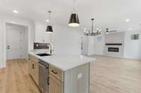 Inside, sunlight spills across wide- plank hardwood floors, welcoming you into an airy open- concept great room with 9’ ceilings and a dramatic fireplace that anchors the space. The gourmet kitchen impresses with ceiling- height shaker cabinetry, quartz countertops, a custom tile backsplash, and a complete KitchenAid stainless suite featuring a gas cooktop and cabinet hood. A walk- in pantry and built- in cubbies make staying organized effortless. Elegant touches such as soft- close cabinetry, oak stair treads, iron spindles, and detailed trimwork add style and substance at every turn.