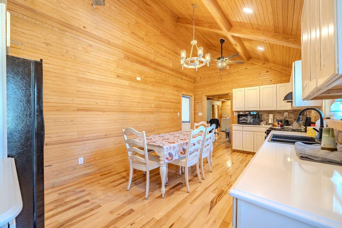 Well- maintained home featuring hardwood floors, tongue- and- groove wood walls and ceilings, and vaulted ceilings with exposed beams throughout. Open living and dining areas flow into the kitchen with ample cabinetry, tile backsplash, and coffee/ breakfast bar. Spacious bedrooms include hardwood flooring and ceiling fans. Exterior features include a covered front porch, large rear deck, concrete driveway, fully fenced backyard, and storage building. An attached unfinished flex room offers excellent potential for a chill zone, sports cave, hobby room, or additional living space. Convenient Oakfield location with easy access to Jackson.