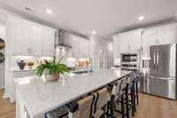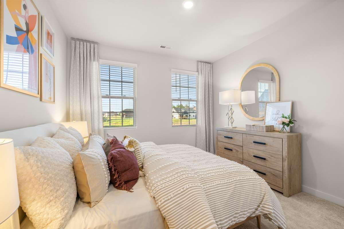 The first floor of this two- story home shares an open layout between the kitchen, nook and family room for easy entertaining and access to the patio for outdoor lounging. A more formal dining room is at the front of the home for dinner parties and a study to work from home. Two bedrooms are on the first floor, including a luxe owner' s suite and a secondary bedroom, ideal for overnight guests. Upstairs are three secondary bedrooms, a versatile game room and a media room for added living space. * Images from a furnished model of this home. Actual configuration and features may vary.
