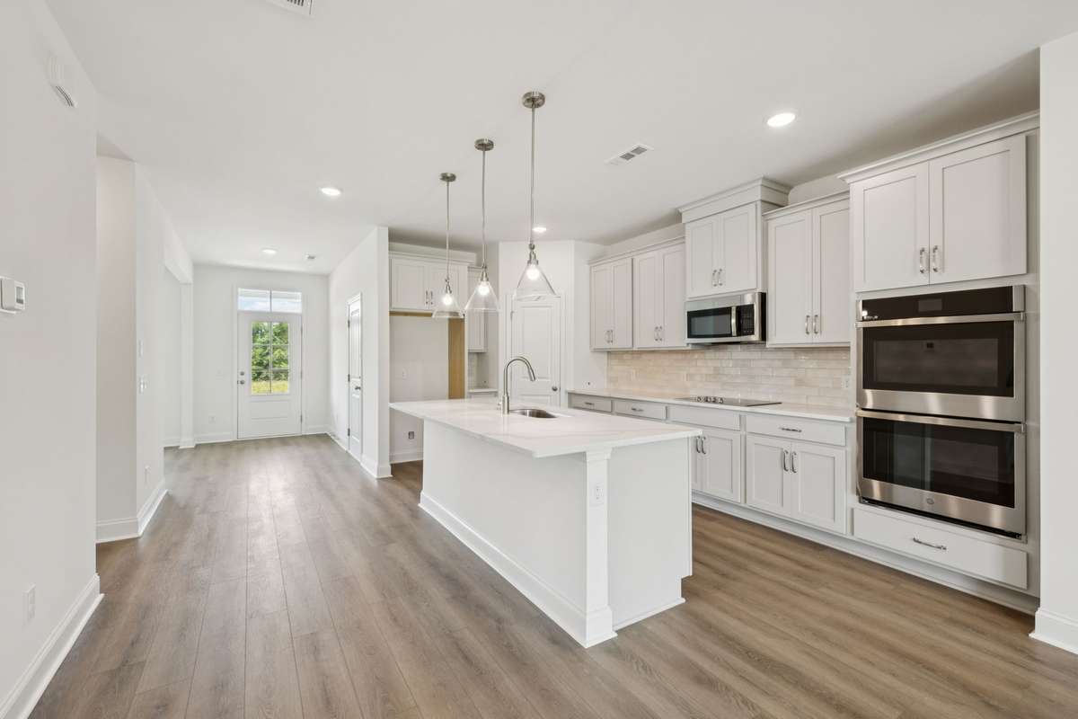 The kitchen is ideally situated at the heart of the home, connecting seamlessly to the great room, breakfast area, and flex space.