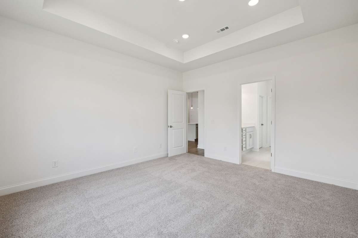 A first-floor primary retreat with a trey ceiling, offers a private and stylish space for relaxation.