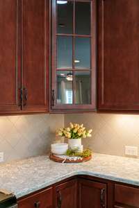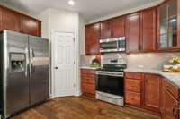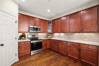 The spacious kitchen features rich cherry cabinetry, granite countertops, and a generous eat- in bar, along with abundant storage, including a charming glass- front corner cabinet, walk- in pantry, and two convenient lower pull- out cabinets. All Frigidaire appliances are included, including the refrigerator, washer, and dryer. Additional highlights include Levolor 2" slatted blinds throughout the home and a safety railing at the front steps ( only two steps) .