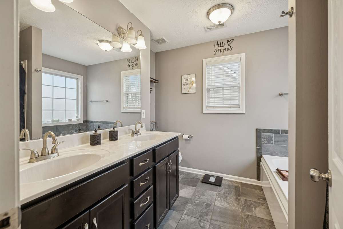 Primary bathroom with dual sink vanity and generous counter space.